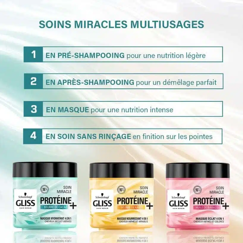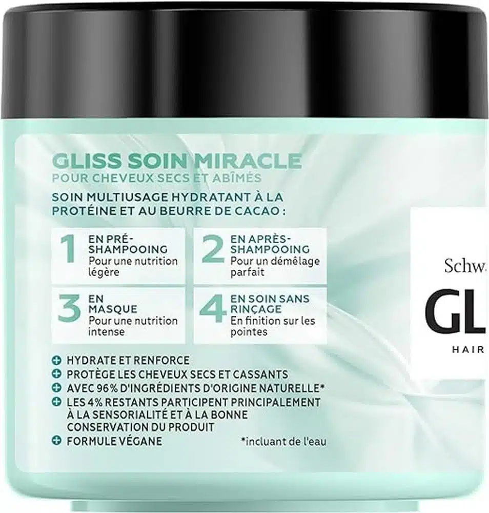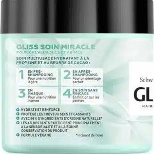 موهای سالم و زیبا نیازمند مراقبت و تغذیه مناسب هستند، به خصوص اگر موهای شما خشک و آسیب دیده باشند. ماسک مو پروتئینه 4 کاره گلیس Gliss یکی از محصولات برجسته در این زمینه است که با ترکیبات مغذی و تقویت کننده، به موهای خشک و آسیب دیده کمک میکند تا به حالت مرطوب و درخشان خود بازگردند. خاصیت آبرسانی و مرطوب کنندگی ماسک گلیس، موهای خشک و آسیب دیده را ترمیم کرده و آنها را نرم و لطیف کند. این ماسک حاوی ویتامینها، مواد معدنی و اسیدهای چرب همچون روغن کاکائو و پروتئین سویا می باشد که موها را تغذیه میدهد و مواد مغذی مورد نیاز را به آنها ارائه میکند. ماسک مو پروتئینه 4 کاره گلیس میتواند به کاهش التهاب پوست سر نیز کمک کند. این خاصیت میتواند به بهبود شرایط مرتبط با خشکی پوست سر، خارش و التهابات موجود در آنها کمک کند. همچنین میتواند باعث حفظ و ثبات رنگ موها شود و از فروکش کردن و زودتر پریدن رنگ آنها جلوگیری کند. ماسک موی گلیس حاوی عصاره روغن کاکائو با ترمیم و بازسازی رطوبت به رشته های آسیب دیده شما کمک زیادی می کند و در عین حال انواع تهدیدات خارجی مانند موخوره و دو شاخه شدن انتهای مو را ترمیم می کند.ویژگی های ماسک مو پروتئینه 4 کاره گلیس