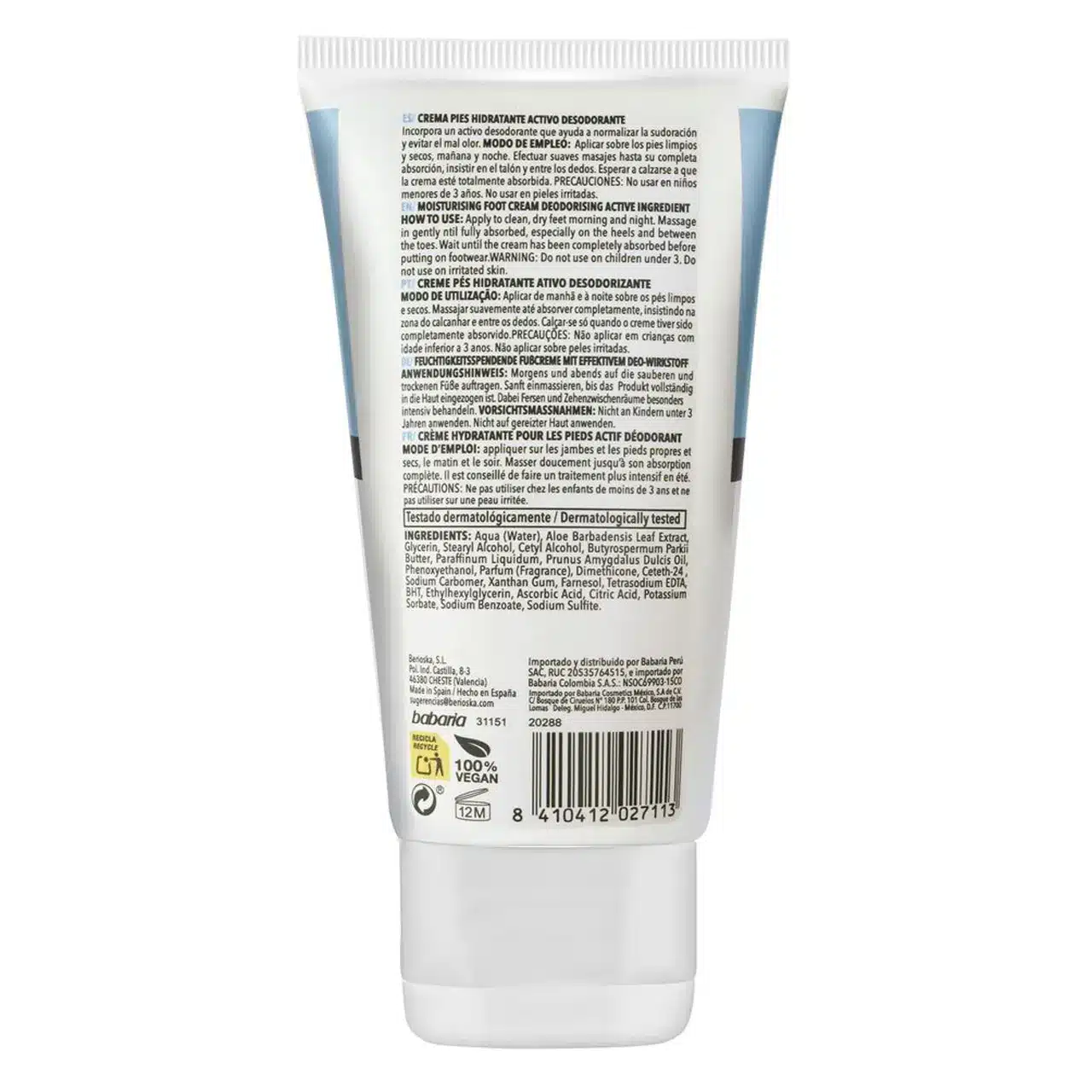 مشخصات کرم مرطوب کننده و خوشبو کننده پا باباریا Babaria حاوی عصاره آلوئه ورا | حجم 150 میل