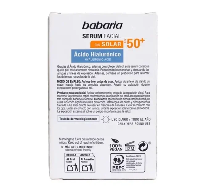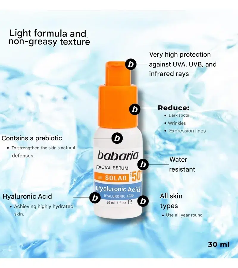 محافظت از پوست در برابر اشعههای مضر خورشید، یکی از مهمترین قدمها در روتین مراقبتی است. برند اسپانیایی باباریا (Babaria) با بهرهگیری از ترکیب هیالورونیک اسید ، نیاسینامید و پریبیوتیکها محصولی نوآورانه به نام +Babaria Solar Hyaluronic Acid Facial Serum SPF50 را ارائه کرده است.