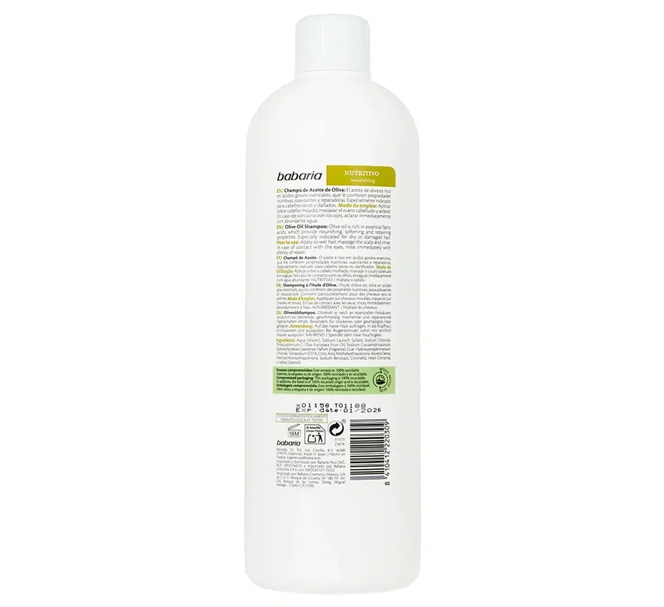مشخصات شامپو مغذی مو باباریا Babaria مدل Olive Oil Nourishing – حاوی روغن زیتون – ترمیم و تغذیه موهای خشک و آسیبدیده | حجم 700 میلیلیتر