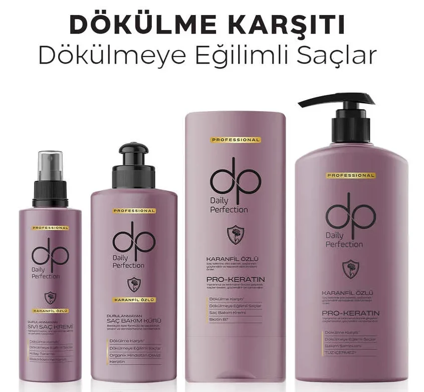 اسپری موی بدون نیاز به آبکشی Daily Perfection حاوی عصاره میخک (Karanfil Özlü) یک محصول مراقبتی تخصصی برای موهای آسیبپذیر و مستعد ریزش است. این محصول ساخت ترکیه بوده و در حجم 180 میلیلیتر عرضه میشود.