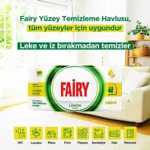- دستمال مرطوب Fairy زرد: بر اساس اطلاعات موجود، دستمالهای Fairy زرد رنگ اغلب با رایحه لیمو عرضه میشوند و بر قدرت چربیزدایی بالا برای سطوح آشپزخانه (مانند اجاق گاز، سینک، فر و سطوح کابینت) تمرکز دارند. برخی ممکن است خاصیت ضد باکتری نیز داشته باشند و 99.9% باکتریها و ویروسها را از بین ببرند.