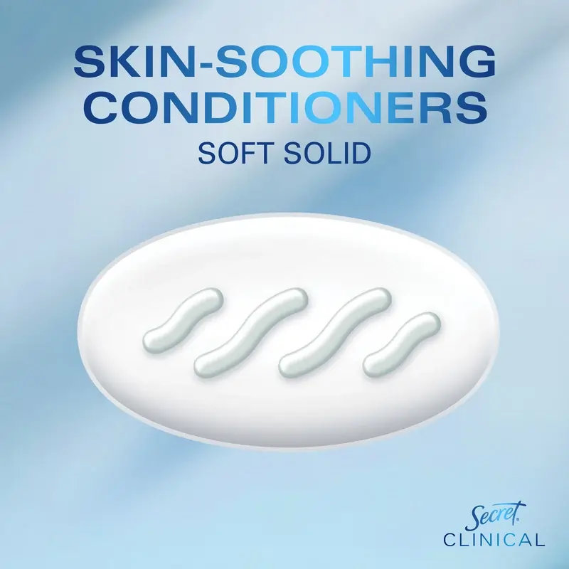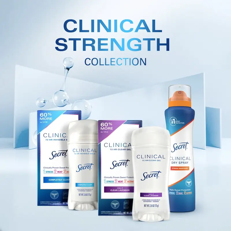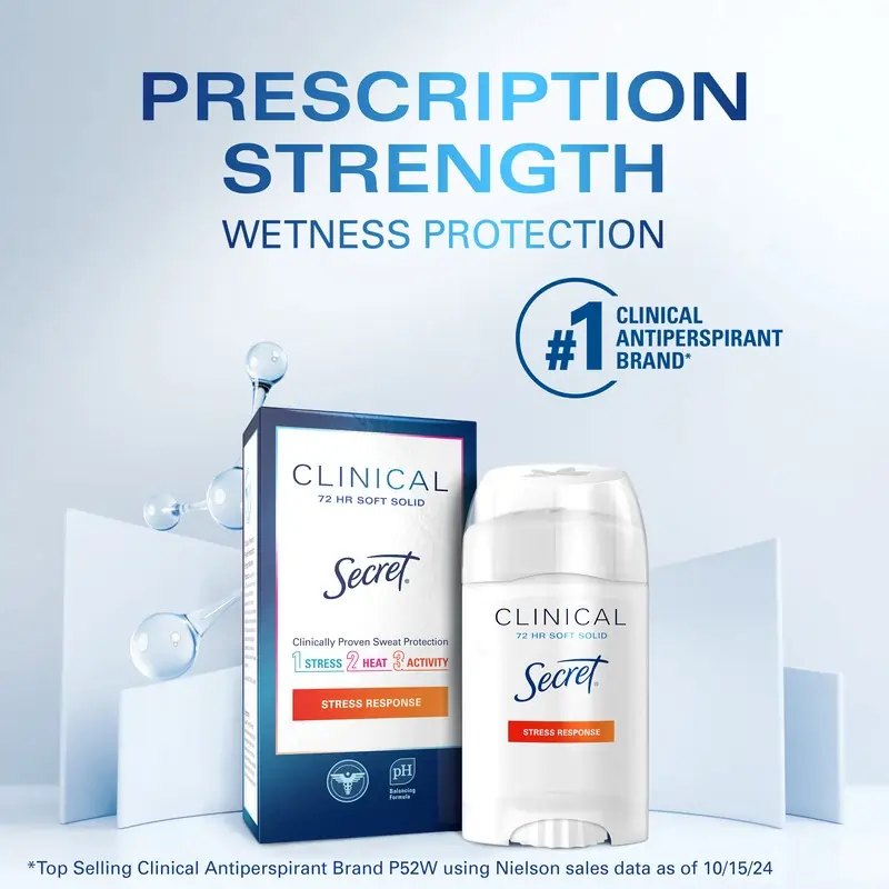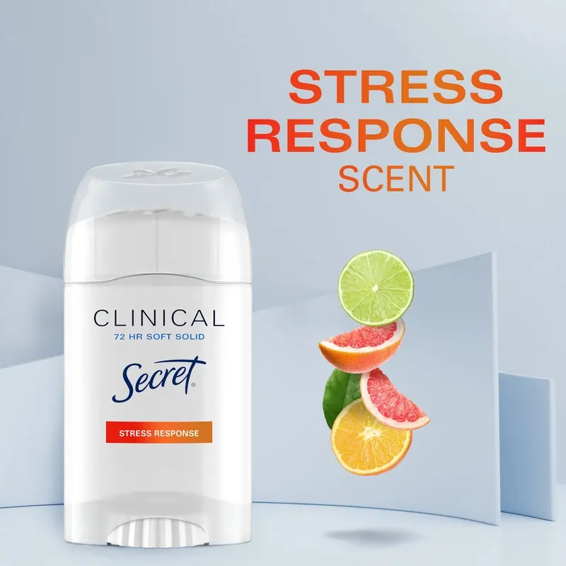 دئودورانت و ضدتعریق سکرت کلینیکال، یکی از محصولات پیشرفته برند Secret است که با بهرهگیری از فناوری اختصاصی Procter & Gamble، برای افرادی که با تعریق شدید، بهویژه در شرایط استرس روانی یا فیزیکی مواجه هستند، طراحی شده است.این محصول بافت Soft Solid دارد که ترکیبی میان استیک و کرم است؛ در نتیجه، استفاده از آن راحت بوده و بهطور یکنواخت روی پوست پخش میشود. فرمولاسیون کلینیکال استرنت این محصول قادر است تا 72 ساعت از تعریق و بوی نامطبوع جلوگیری کند و یکی از قویترین محصولات در دسته ضدتعریقهای بدون نسخه محسوب میشود.
